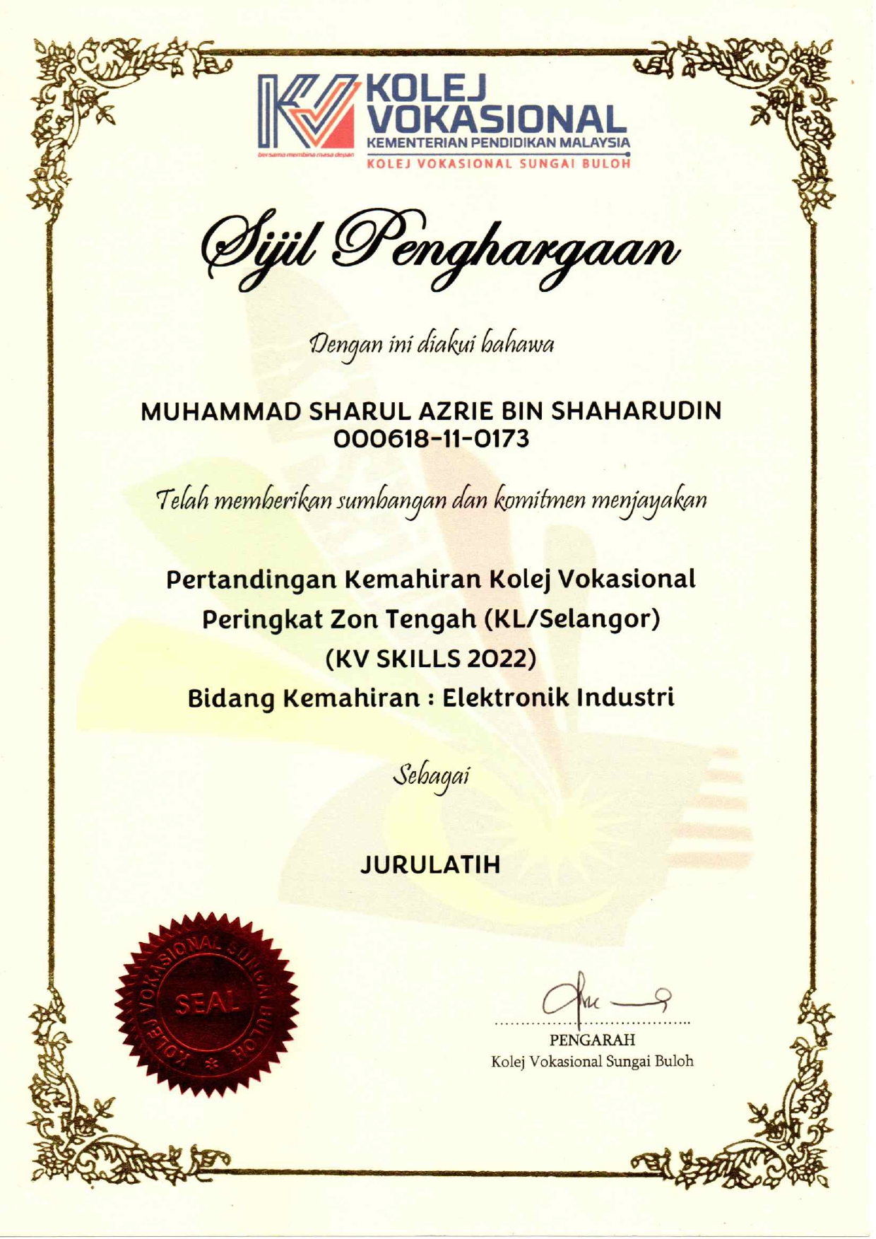 Coach, Central Zone Vocational College Skills Competition (KL/Selangor) (KVSKILLS 2022)Area of Expertise: Industrial Electronics