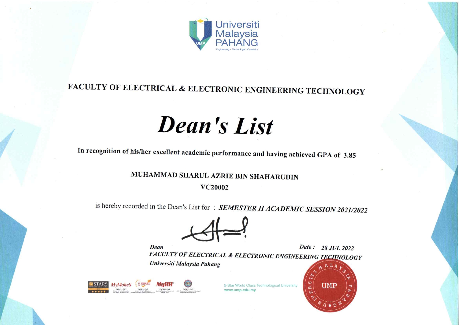 Bachelor of Technology Industrial Electronics Automation With Honours. CGPA: 3.85/3.89, Dean's ListGraduation year: 2024